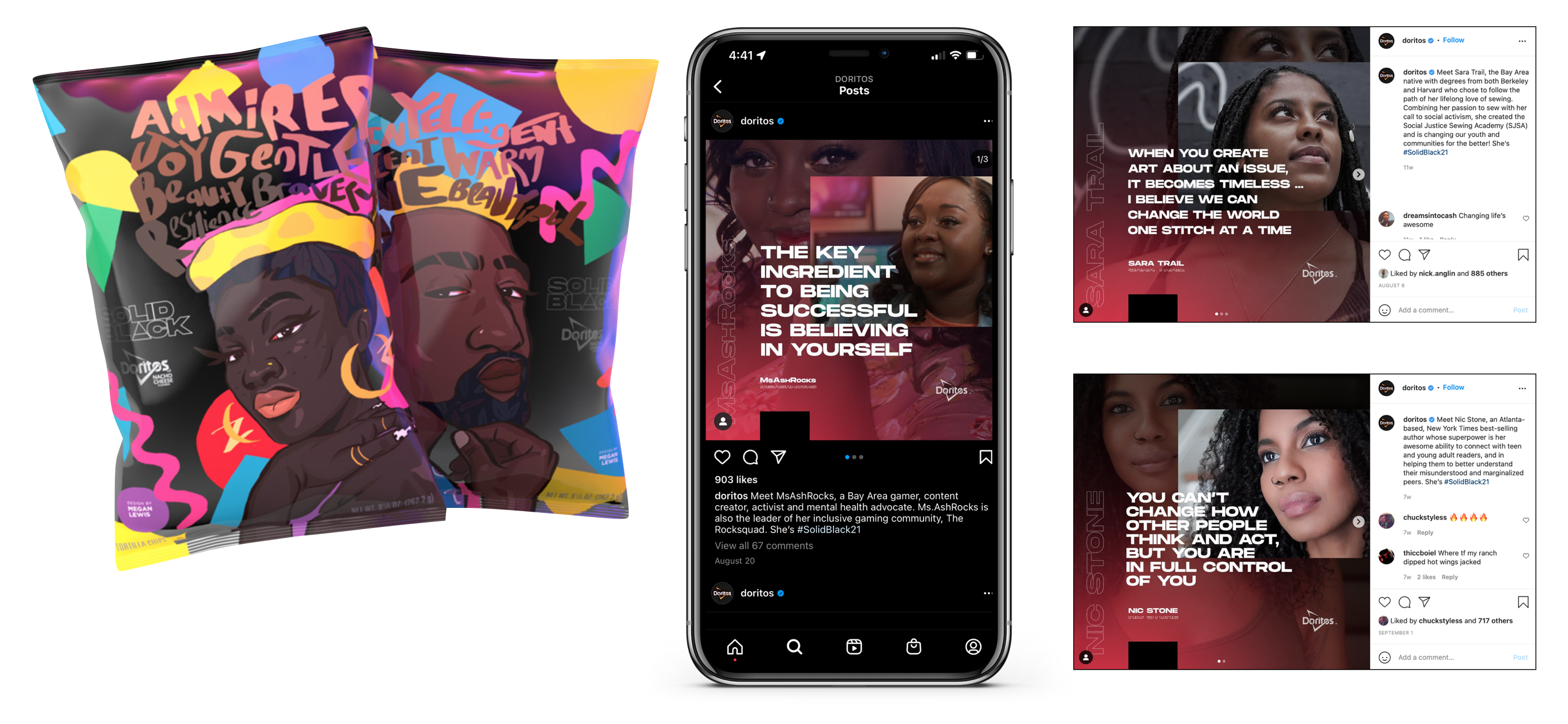 Created Doritos Solid Black as a multi-channel platform for highlighting and showcasing a range of young, Black “changemakers” who make a difference in their communities by being bold in their assertion of self-confidence, pride, and service in a positive, ownable way.